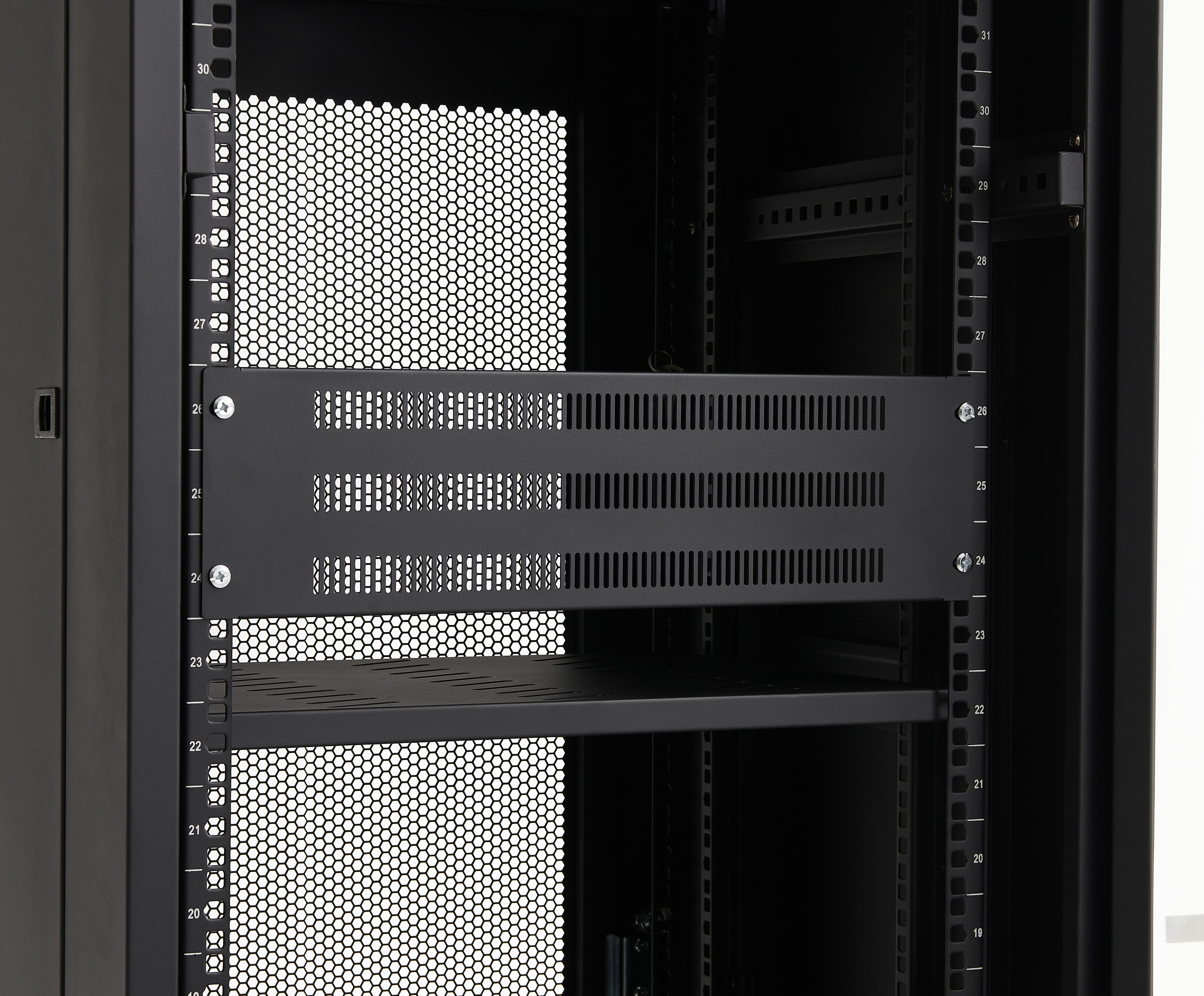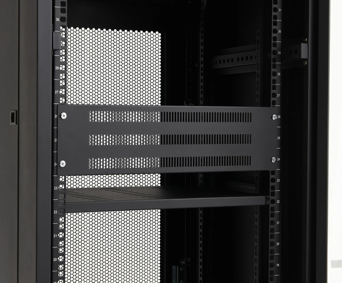 Zaslepovací panel pro 19" rack systémy s odvětrávací perforací.