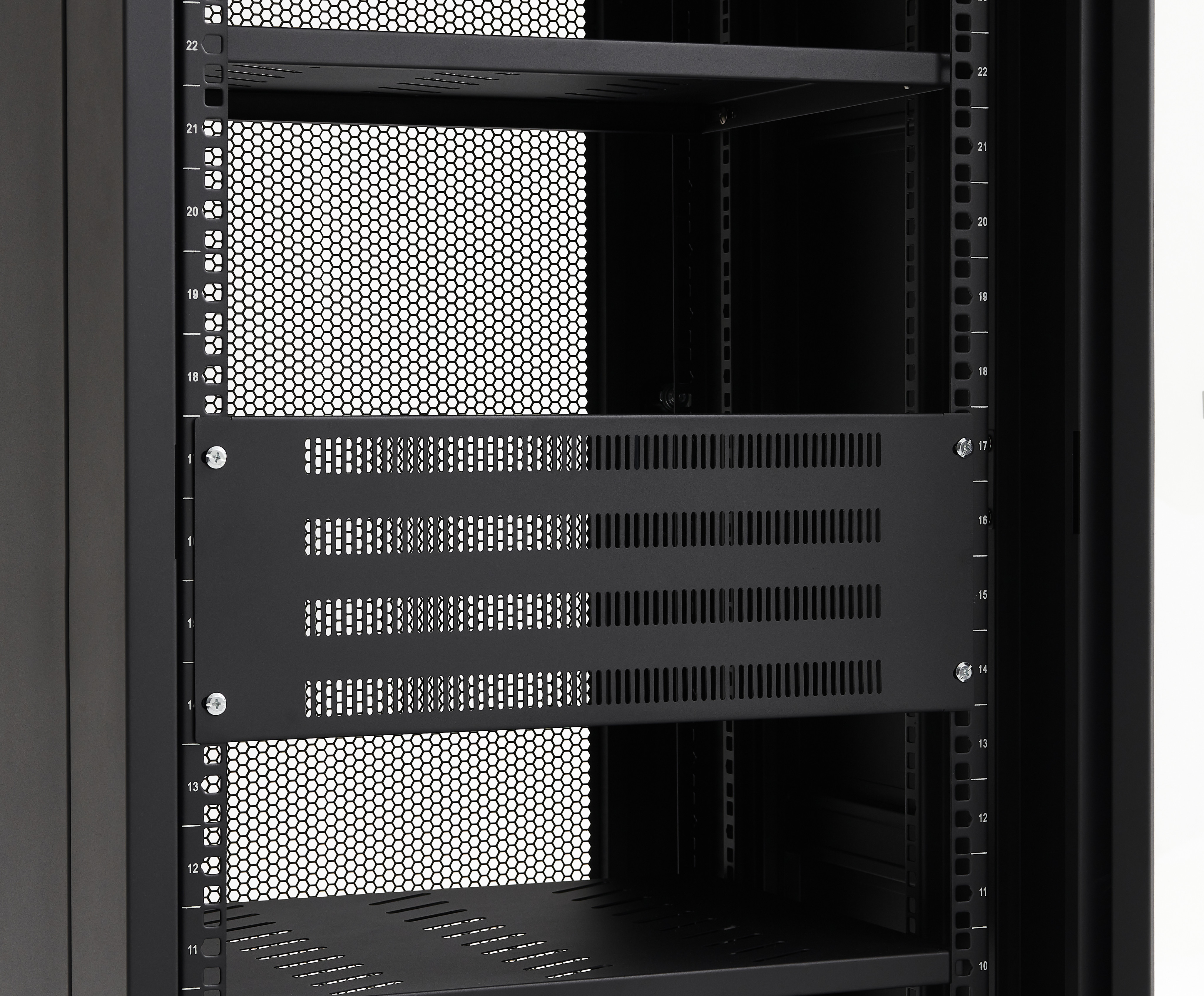 Zaslepovací panel pro 19" rack systémy s odvětrávací perforací.