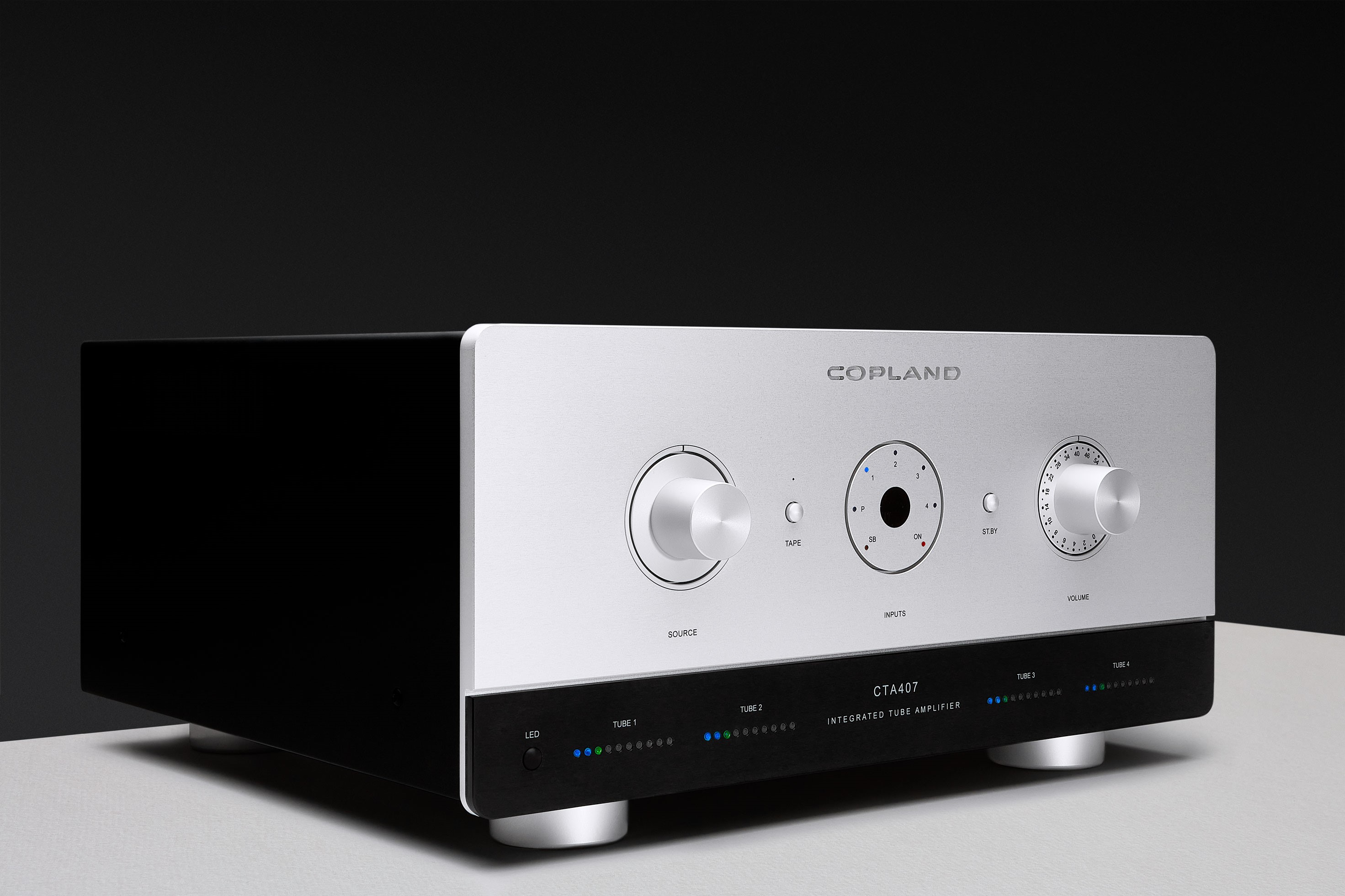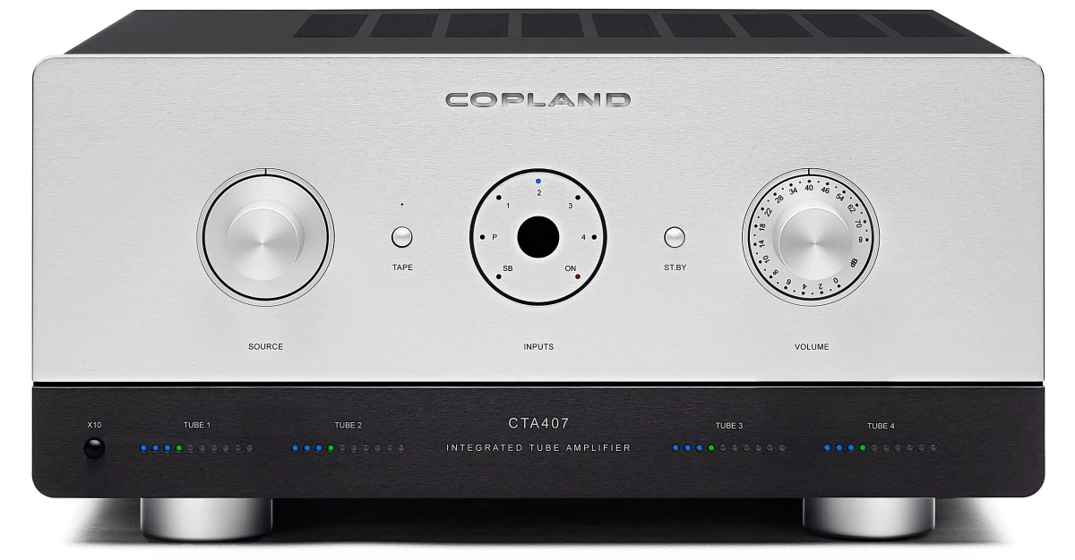 Komplet elektronkový integrovaný zesilovač Copland. Vlajková loď. Obsahuje sofistifikovaný systém kalibrace a nastavení jednotlivých elektronek. Proto stále pracuje v optimálním módu a umožňuje použití více druhů elektronek.