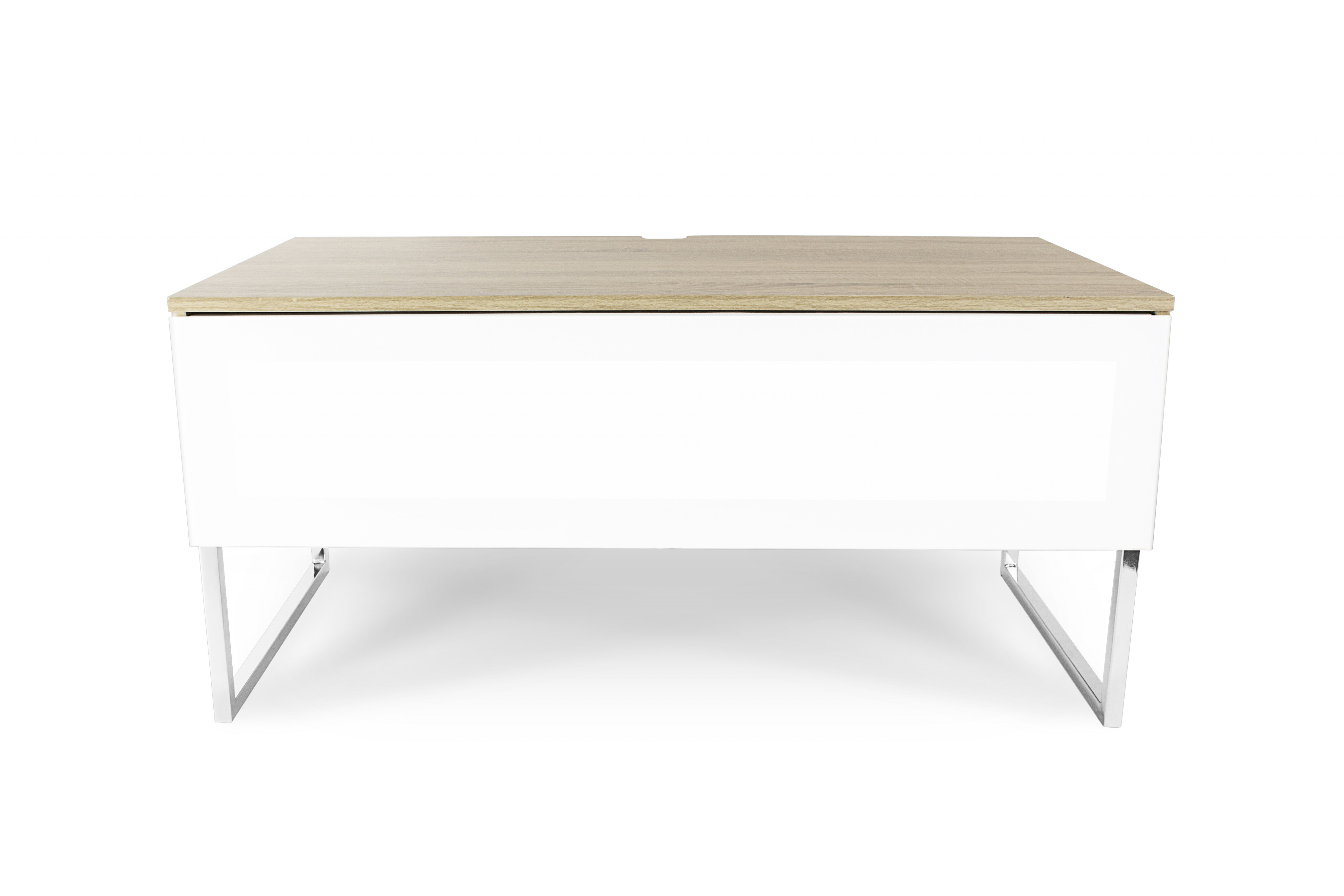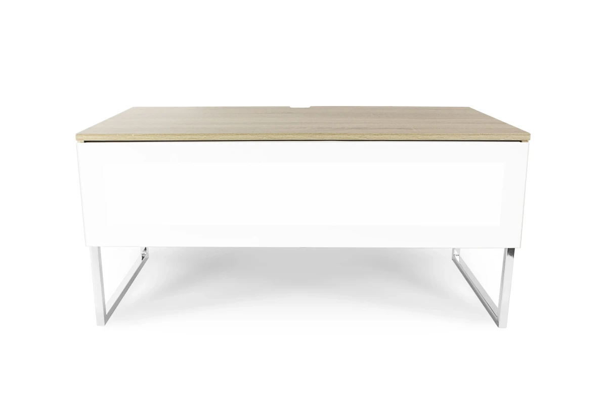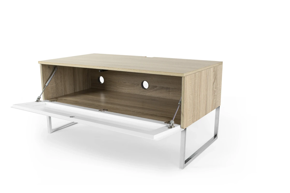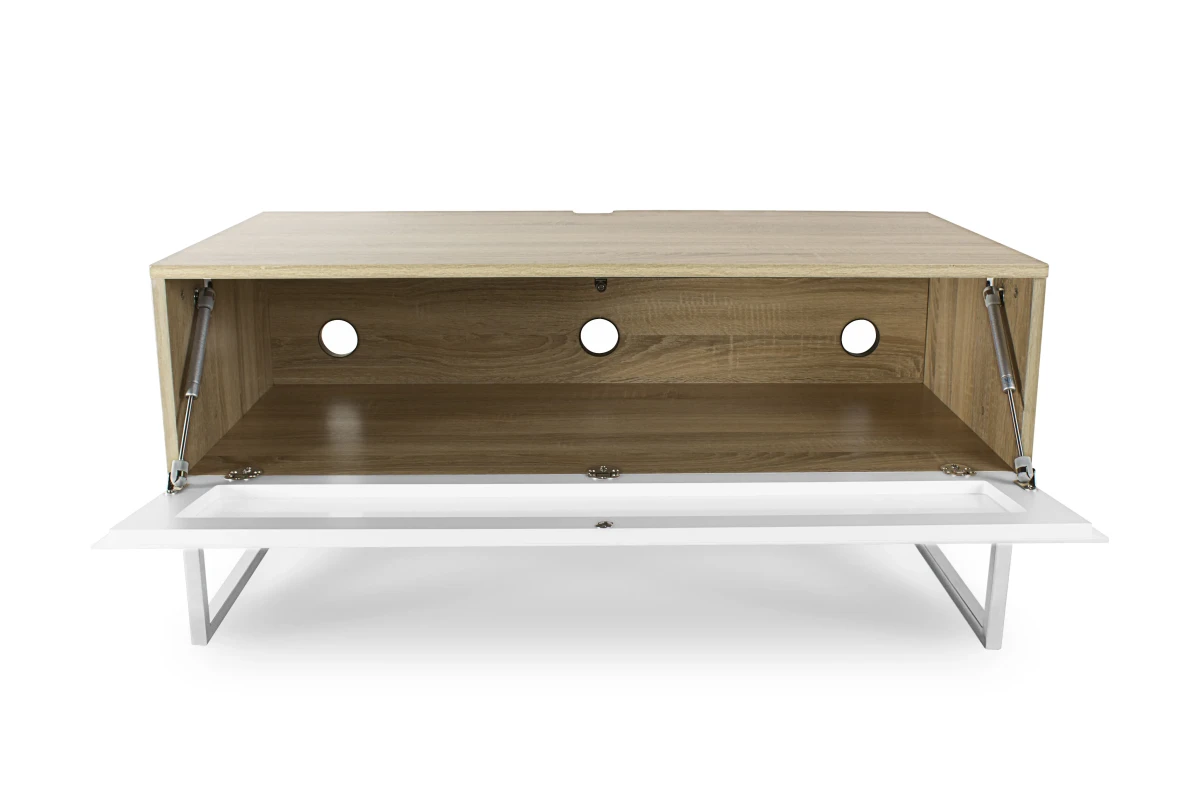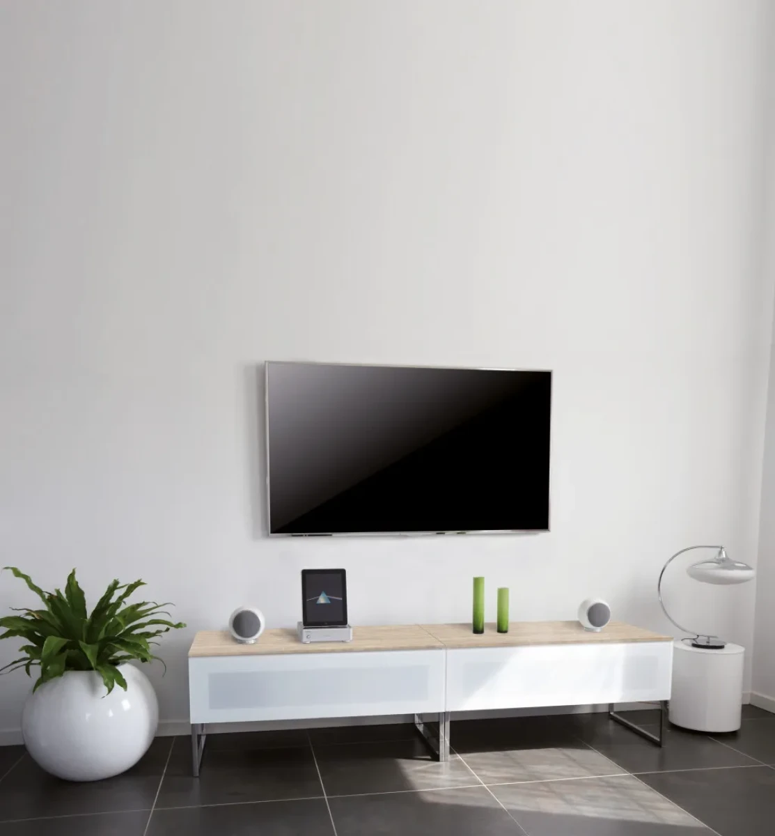 Elegantní skříňka na komponenty Khalm může stát samostatně na podlaze nebo pevně uchycena ke zdi.