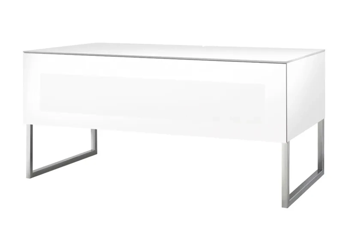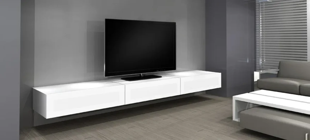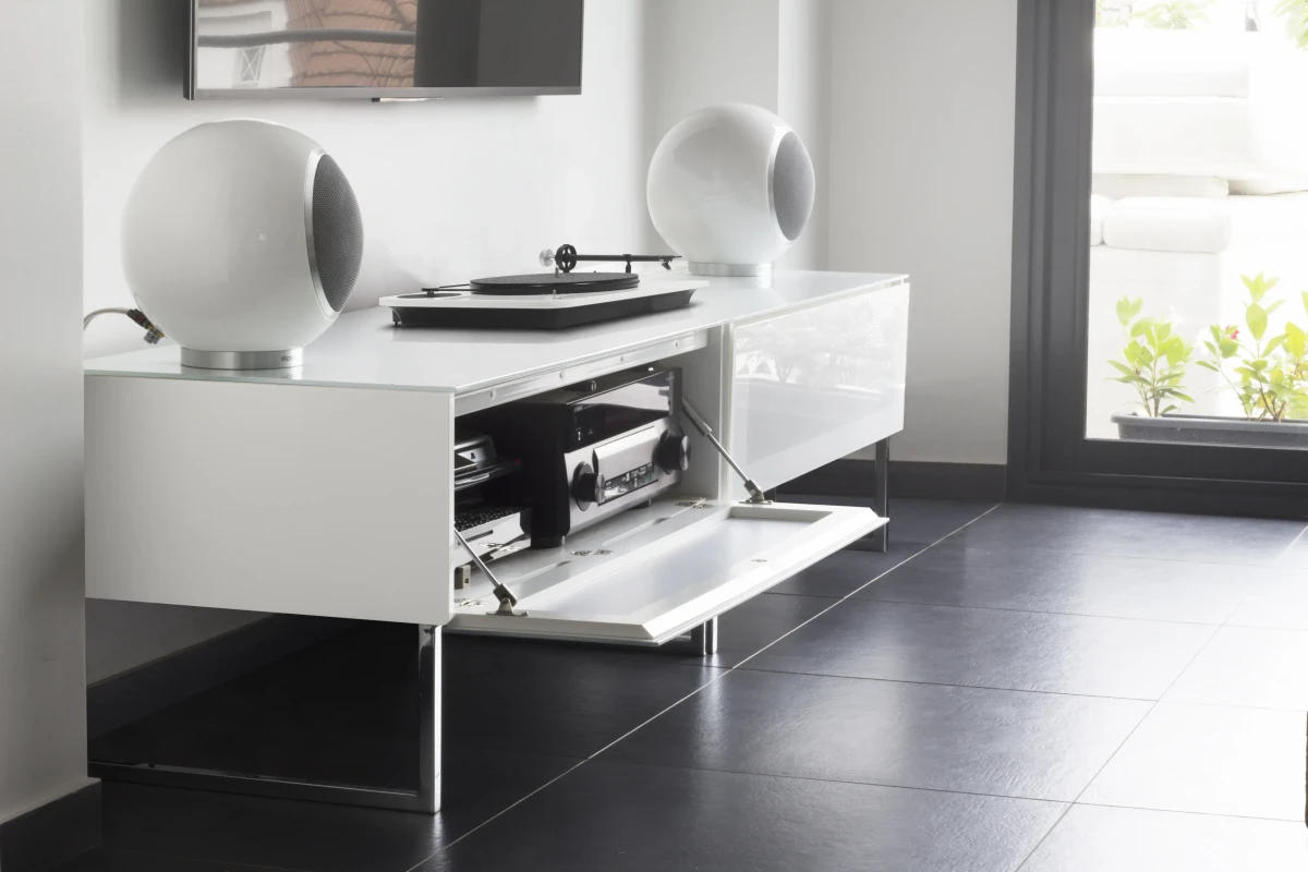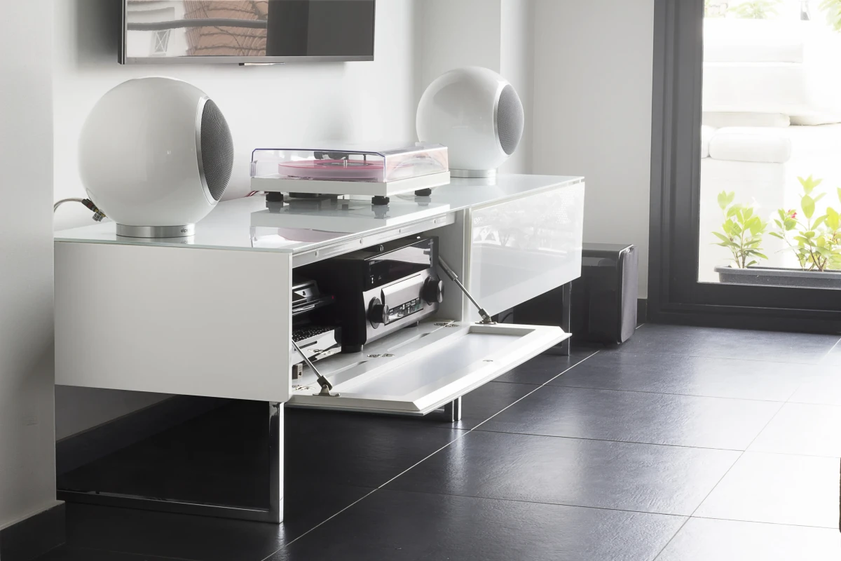 Elegantní skříňka na komponenty Khalm může stát samostatně na podlaze nebo pevně uchycena ke zdi.