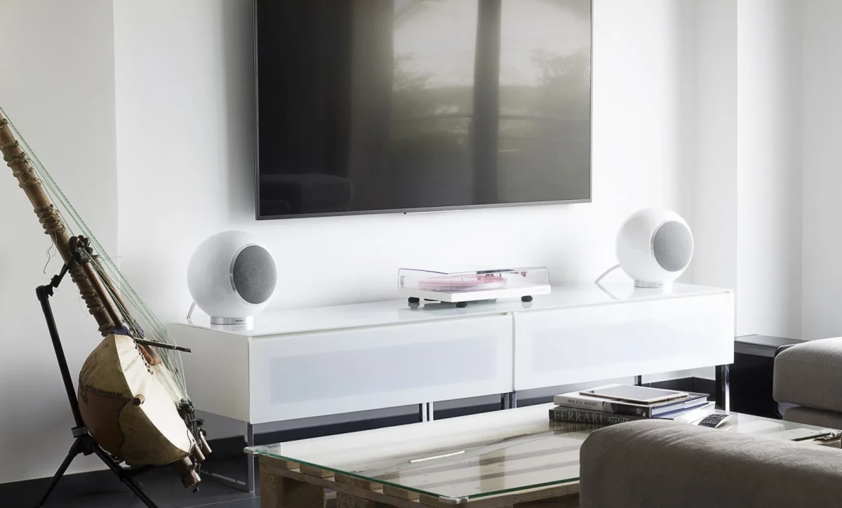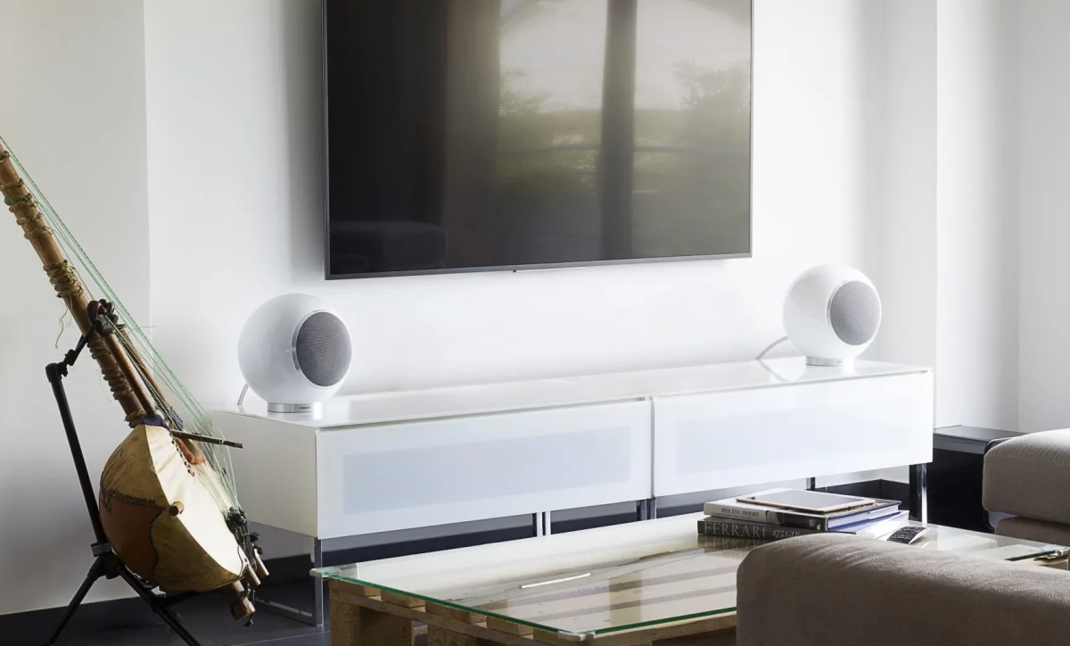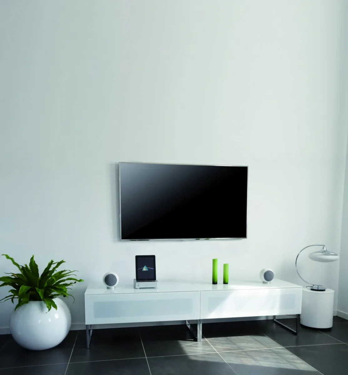 Elegantní skříňka na komponenty Khalm může stát samostatně na podlaze nebo pevně uchycena ke zdi.