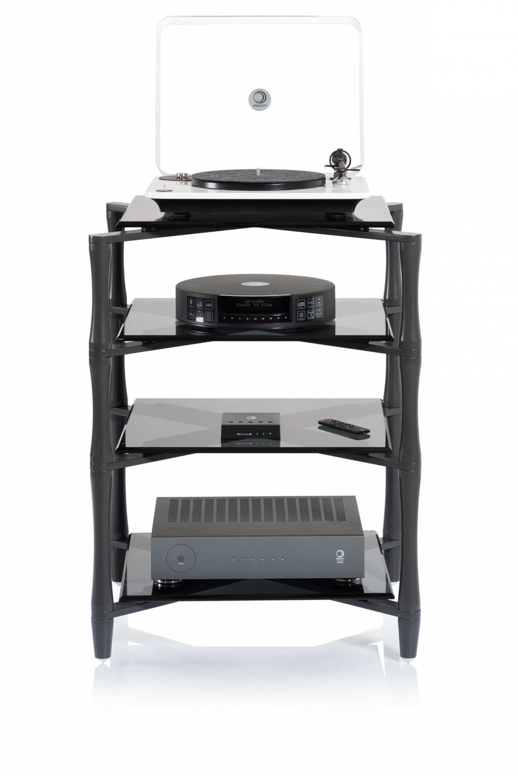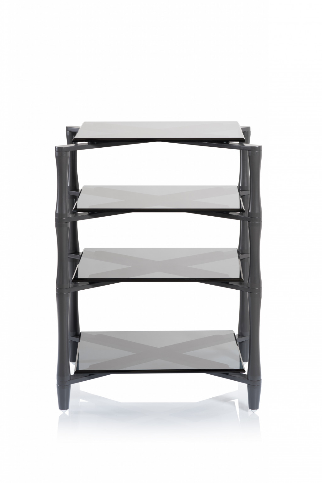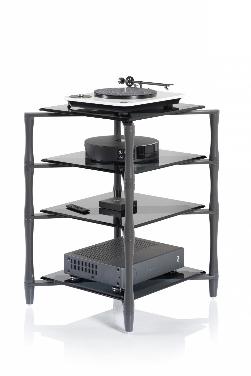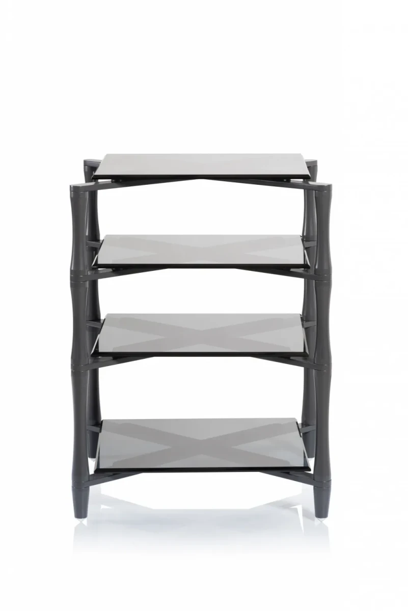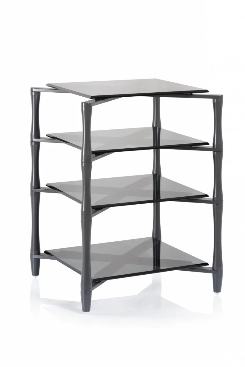 Robustní High End regál na komponenty. Provedení ve "zbraňové" šedi je, v kombinaci s tmavým, fazetovaným tvrzeným sklem, velmi elegantní. Tvar masivních stojin přitom celou konstrukci celkově opticky "odlehčuje".